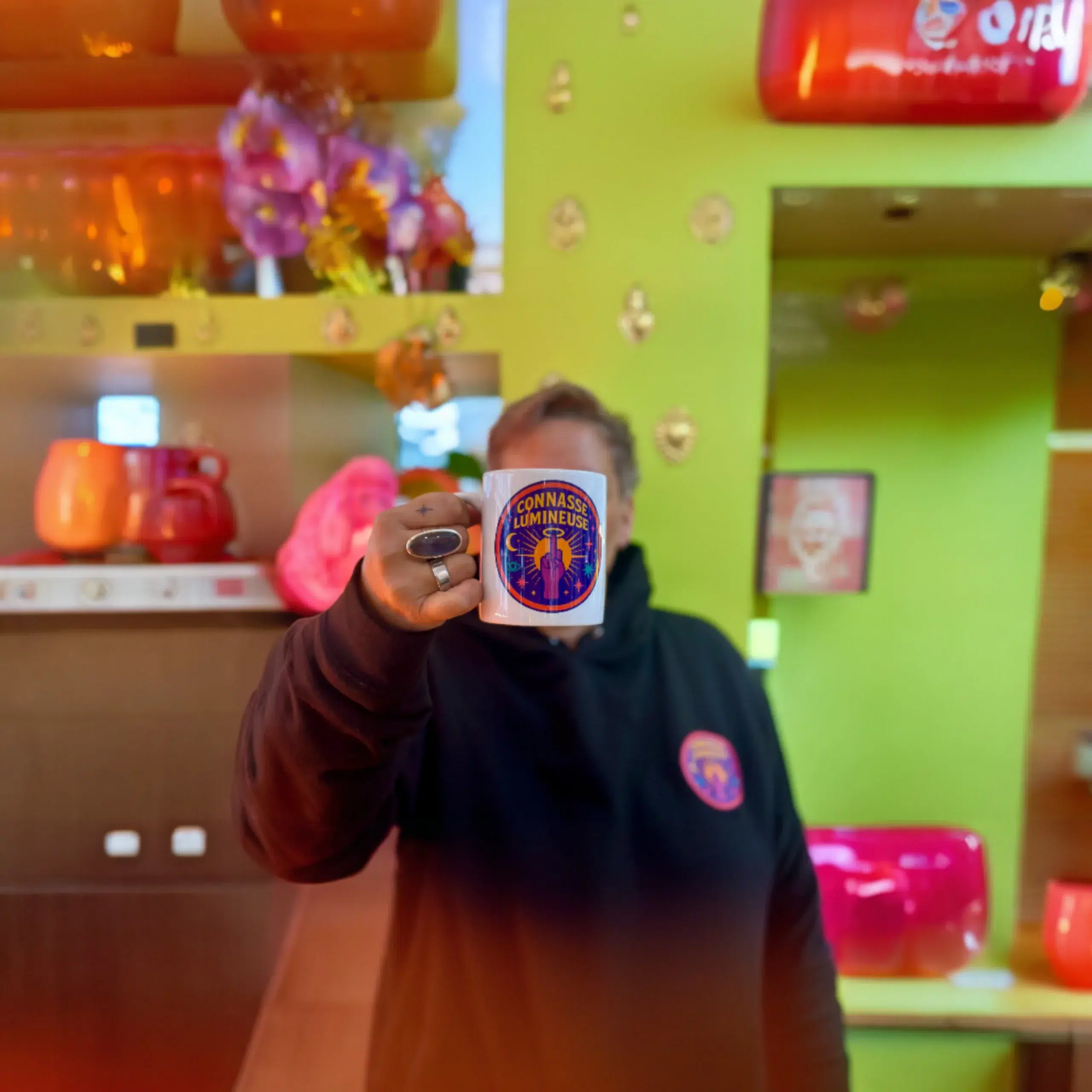 Ici, on ne vend pas seulement un oracle qui vous dis la vérité nue, des t-shirts et sweats qui revendiquent votre côté lumineux mais pas lisse, des tote bags pour trimbaler vos mantras… et des mugs pour savourer votre tisane en pleine introspection explosive.